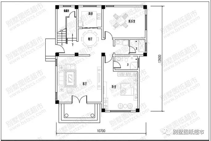 一 層:客廳、臥室(附衛(wèi)生間)、娛樂室、廚房、餐廳、儲(chǔ)藏間、衛(wèi)生間