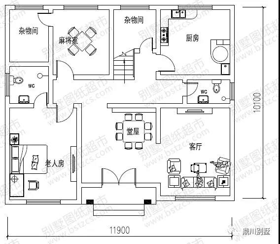 一 層:堂屋、客廳、老人房(附衛(wèi)生間)、麻將室(附雜物間)、雜物間、廚房(兼餐廳)、衛(wèi)生間