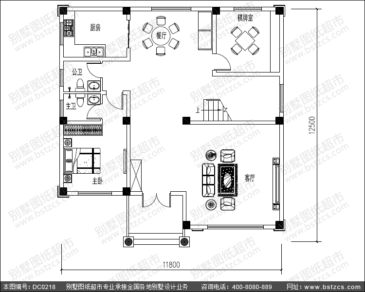 一 層:客廳(中空)、臥室(附衛(wèi)生間)、棋牌室、廚房、餐廳、衛(wèi)生間