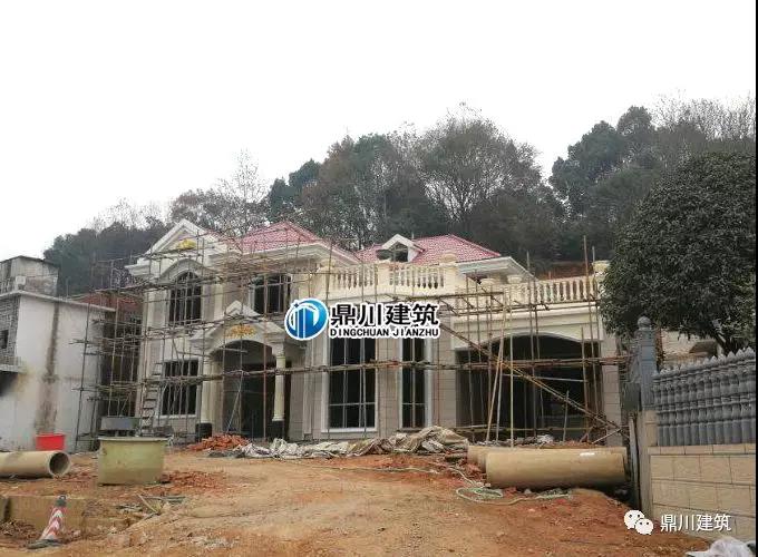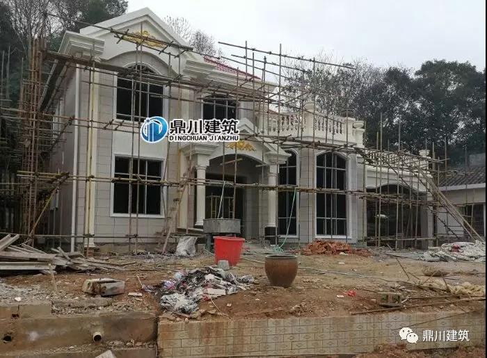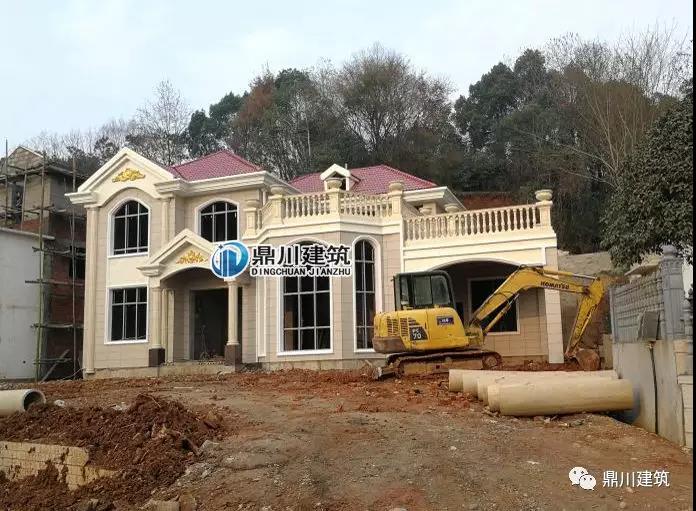 建房實拍圖和效果圖高度一致。淺色的外墻色調(diào)精致典雅,金色的山花,紅色的外墻讓房子整體效果更加生動活潑。