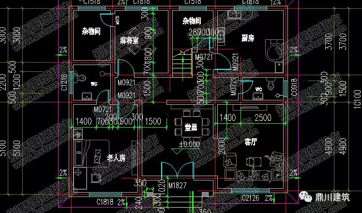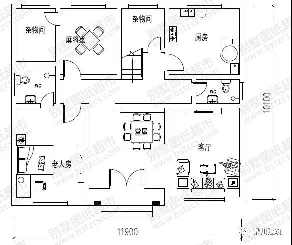 一 層:堂屋、客廳、老人房(附衛(wèi)生間)、麻將室(附雜物間)、雜物間、廚房(兼餐廳)、衛(wèi)生間