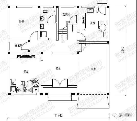 一 層: 堂屋、客廳、臥室、廚房(兼餐廳)、儲藏間、農(nóng)具間、衛(wèi)生間、車庫