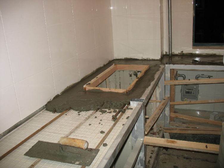 5、安裝臺(tái)面;建議在踢腳線處再加上瓷磚飾面,會(huì)更加美觀;踢腳線嵌入4公分;最后安裝柜門就完工了。