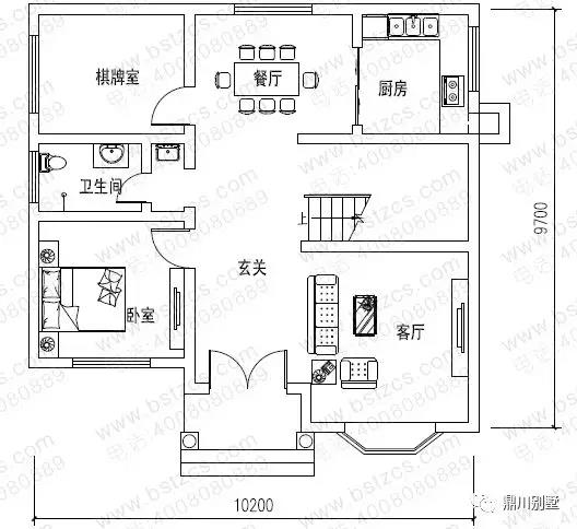 一 層: 玄關(guān)、客廳、臥室、棋牌室、廚房、餐廳、衛(wèi)生間