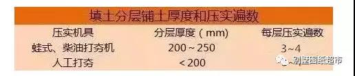 4.碾壓密實:填土分層鋪土的厚度和壓實遍數(shù),應(yīng)結(jié)合壓實機(jī)具,參照表上進(jìn)行;