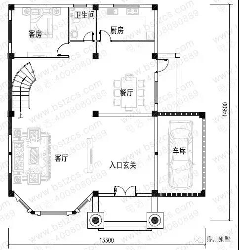 一 層: 入口玄關(guān)、客廳、餐廳、廚房、客房、衛(wèi)生間、車庫