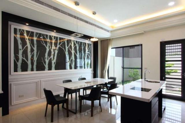 將廚房與用餐區(qū)結(jié)合在一塊,因此整體空間非常寬敞。選擇白色的流理臺(tái)搭配黑色的櫥柜,這間別墅的廚房非常有簡(jiǎn)約現(xiàn)代風(fēng)的味道。