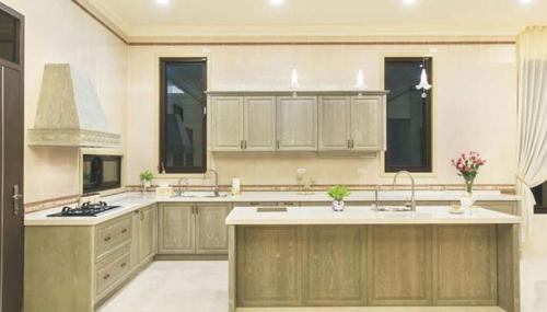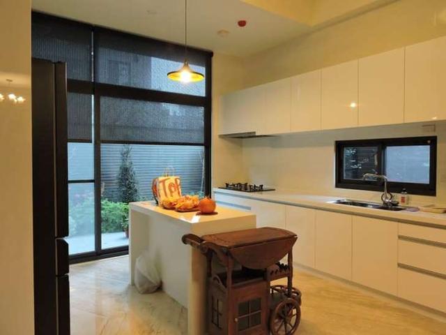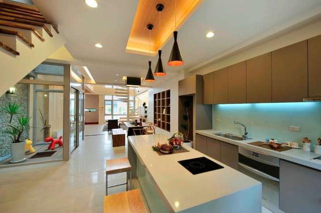 米色系的櫥柜比較有霧面感,與光亮的中島形成對(duì)比。對(duì)于動(dòng)線較長(zhǎng)型的別墅來(lái)說(shuō),是善用空間的好設(shè)計(jì)。