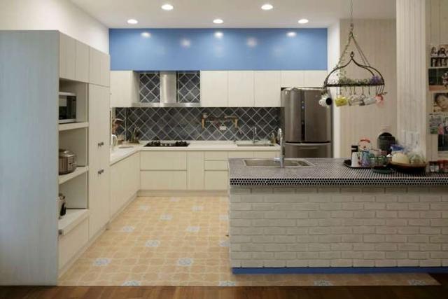 仿舊感的櫥柜非常有特色,而L型加上中島,這樣的格局非常適合常常一起下廚的大家庭!