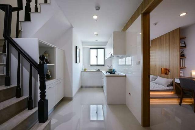 位在角落的 L 型廚房超省空間,而且造型與色系都很極簡(jiǎn),讓畫(huà)面更整潔。
