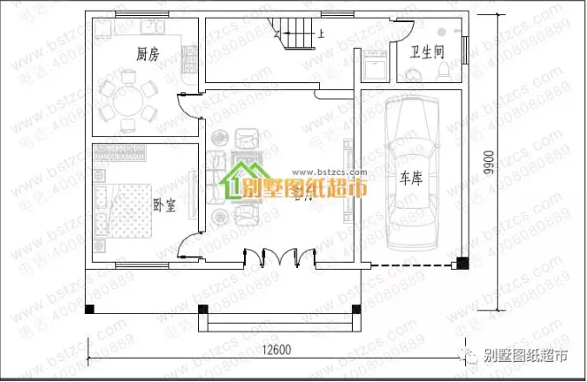 一 層:客廳、臥室、廚房(兼餐廳)、衛(wèi)生間、車庫(kù)