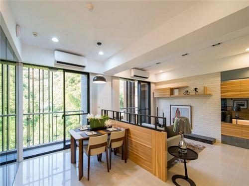 ▲借由半高形式的沙發(fā)背墻,定義著各自獨立的機能屬性。同樣納入借景手法,讓山林芬芳成為最佳餐佐。