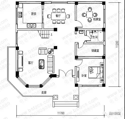 一 層:客廳(中空)、臥室、棋牌室、廚房、餐廳、儲(chǔ)藏室、衛(wèi)生間