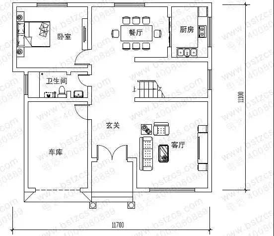 一 層: 客廳、臥室、廚房、餐廳、衛(wèi)生間、車庫(兼儲藏室)