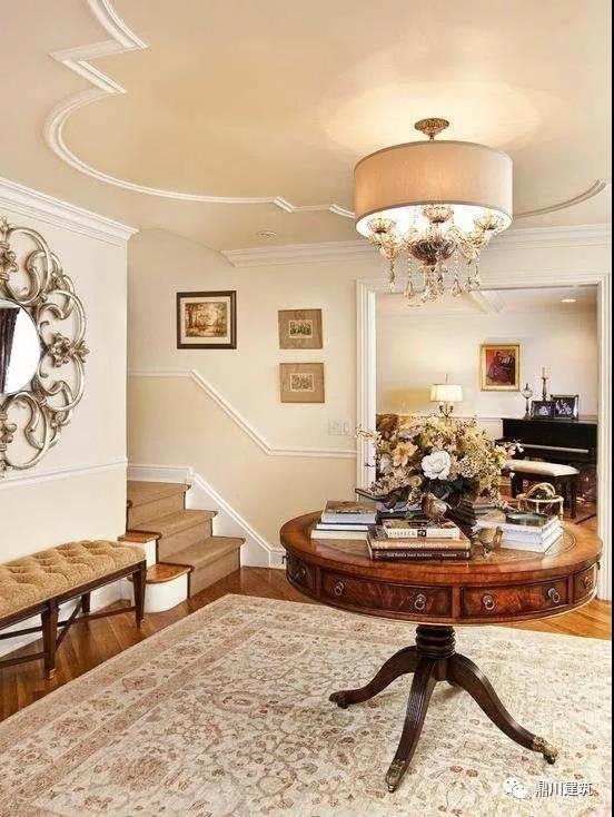 如果家里層高不夠,裝石膏線反而會有種拔高之感,另外簡潔的線條看上去十分大氣。層高較高的也可以裝石膏線,像圖中這樣做在吊燈周圍,既讓天花板看上去不單調,又典雅大氣。