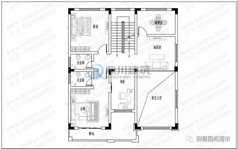 二 層:起居室、臥室(附書房,衛(wèi)生間,陽臺)、臥室、棋牌室、衛(wèi)生間