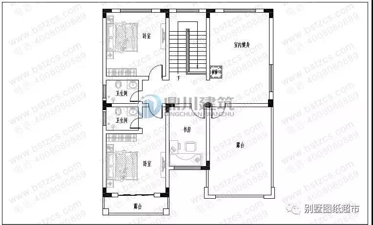 三 層:健身廳、臥室(附衛(wèi)生間,露臺)、臥室、書房、衛(wèi)生間、露臺