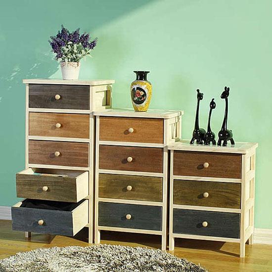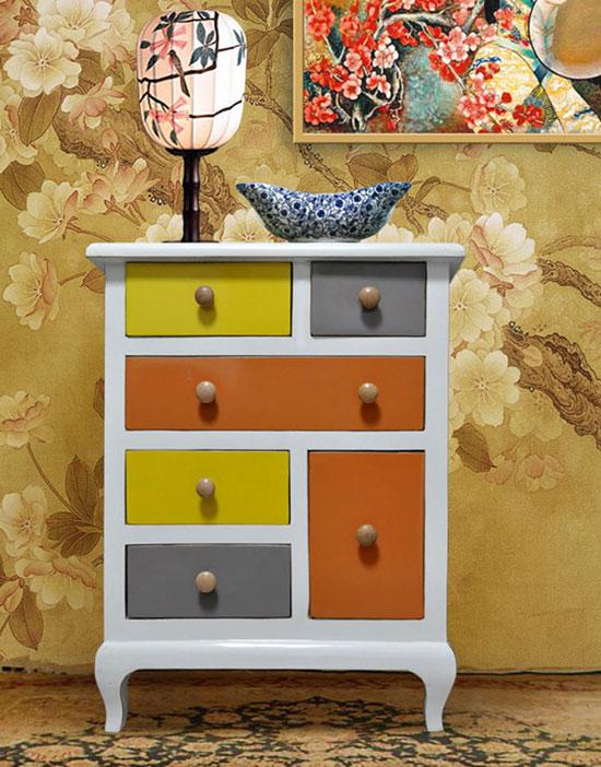 此款斗柜的柜體為白色,每一格抽屜的面板則涂刷了不同的色彩,色塊的拼接顯示出十分現(xiàn)代、時尚的設(shè)計理念。