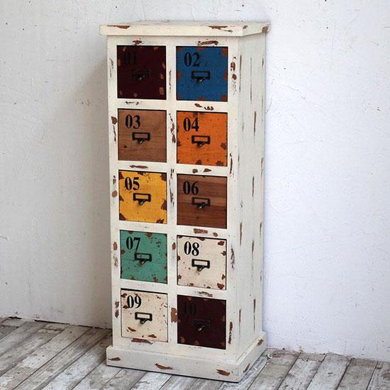做舊質(zhì)感的一款斗柜,剝落的漆面充滿年代感與懷舊感,不同顏色的小方格抽屜則極具躍動感,抽屜上的編號設(shè)計也是意趣十足。