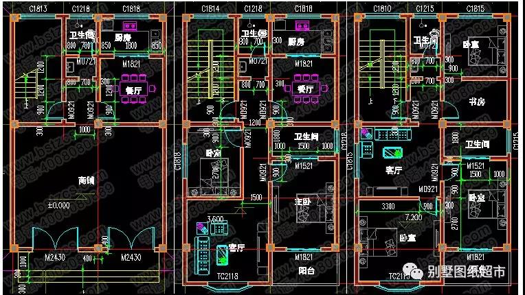 三 層:客廳、臥室(附陽臺、衛(wèi)生間)、臥室(附書房)、臥室、衛(wèi)生間