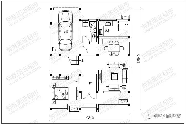 一 層:客廳、老人房、廚房、餐廳、衛(wèi)生間、車庫