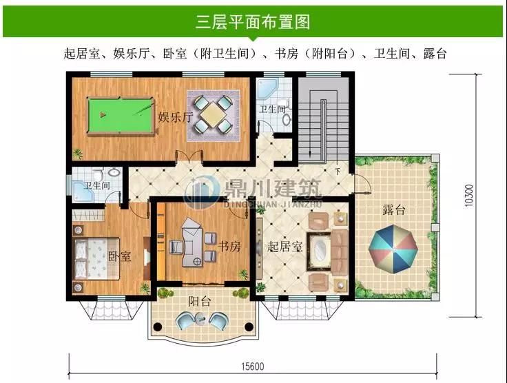 三層設(shè)有起居室、娛樂廳、臥室(附衛(wèi)生間)、書房(附陽臺)、衛(wèi)生間、露臺。一般現(xiàn)在的年輕小孩都喜歡一個人住在一層樓,有自己的私密空間,所以三樓主臥中帶有衛(wèi)生間,和書房,是十分合理的,更別說年輕人最喜歡的娛樂廳與露臺了。