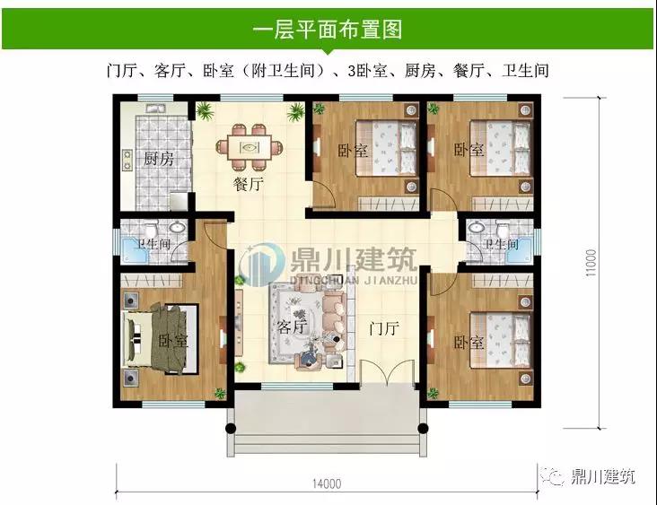 14×11米一層別墅,4個臥室2個衛(wèi)生間,這樣的戶型很完美!