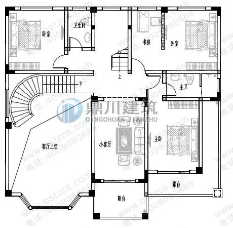 二 層: 小客廳(附陽臺)、臥室(附衛(wèi)生間,露臺)、臥室(附書房)、臥室、衛(wèi)生間