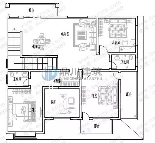 三 層: 活動室、臥室(附衛(wèi)生間)、臥室(附書房)、衛(wèi)生間、陽臺、露臺