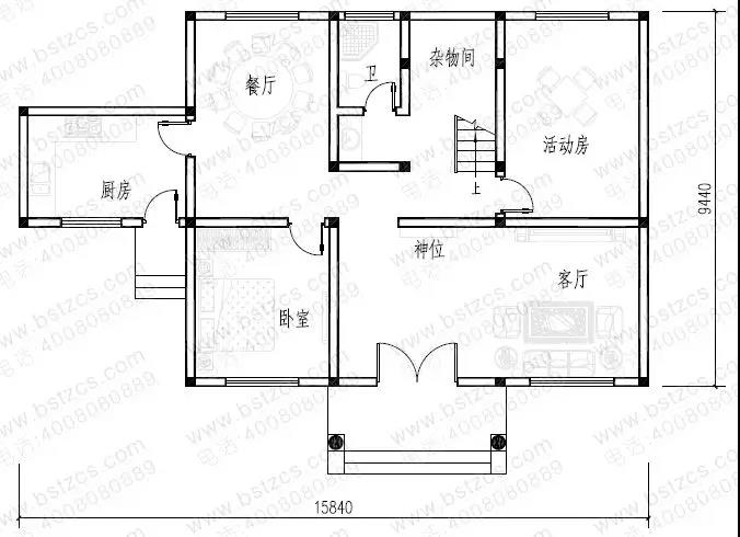 一 層:客廳、臥室、活動房(或臥室)、廚房、餐廳、雜物間、衛(wèi)生間