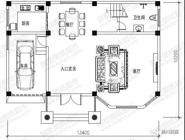 一 層:入口玄關(guān)、客廳、廚房、餐廳、衛(wèi)生間、車庫(kù)