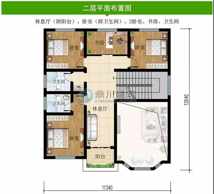 二 層:休息區(qū)(附陽臺)、臥室(附衛(wèi)生間)、2臥室、書房、衛(wèi)生間