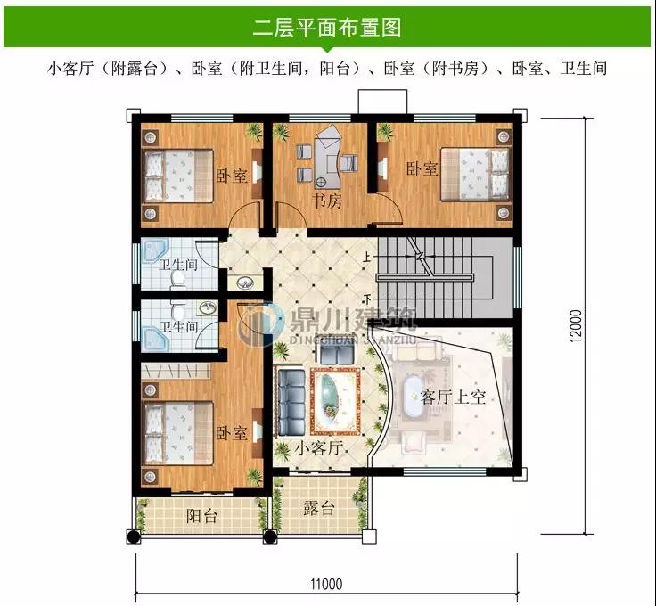 二 層:客廳(附露臺)、臥室(附衛(wèi)生間,陽臺)、臥室(附書房)、臥室、衛(wèi)生間