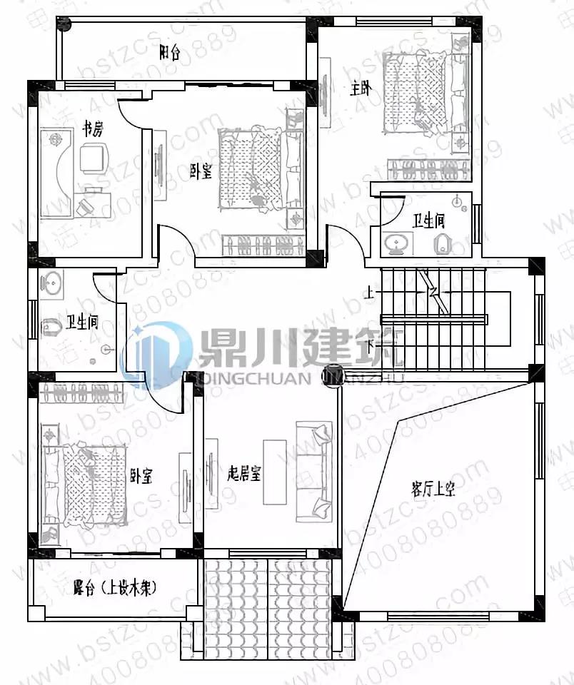 二 層:起居廳、臥室(附陽臺)、2臥室、衛(wèi)生間、書房、露臺