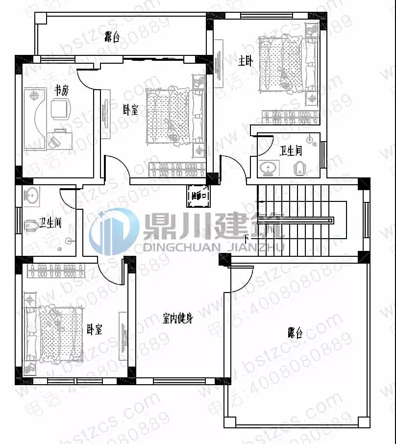三 層:健身廳、臥室(附衛(wèi)生間)、臥室(附書房,露臺)、臥室、衛(wèi)生間、露臺