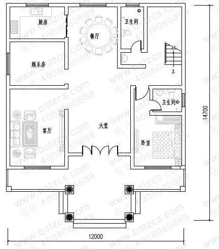 一 層:大堂、客廳、臥室(附衛(wèi)生間)、娛樂房、廚房、餐廳、衛(wèi)生間;