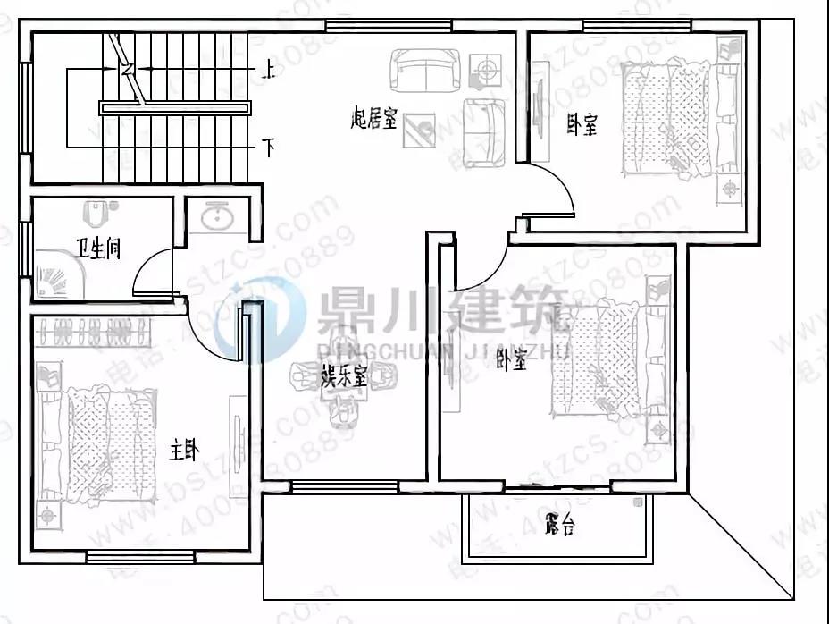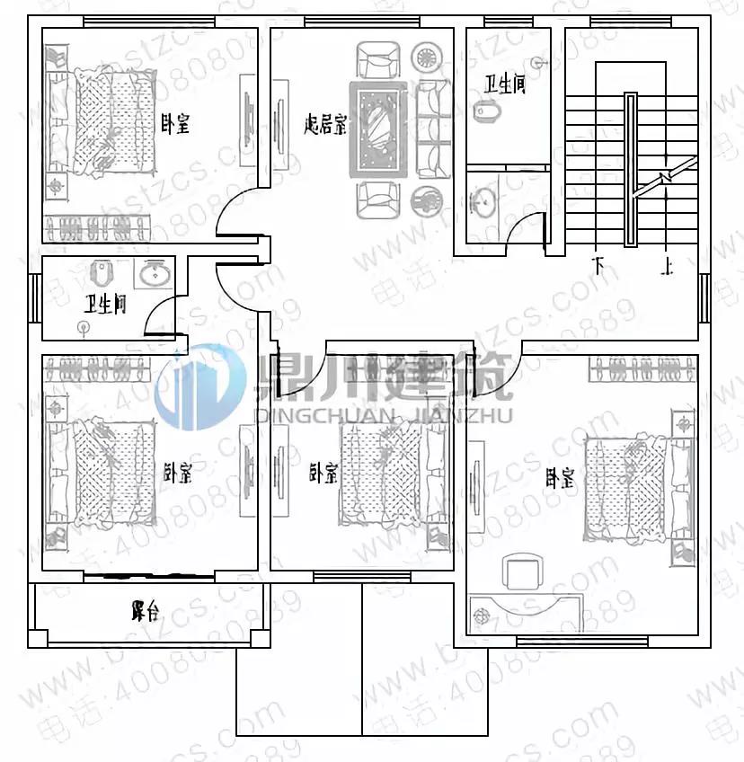 二 層:客廳(附陽臺)、主臥(附衛(wèi)生間)、3臥室、棋牌室、衛(wèi)生間