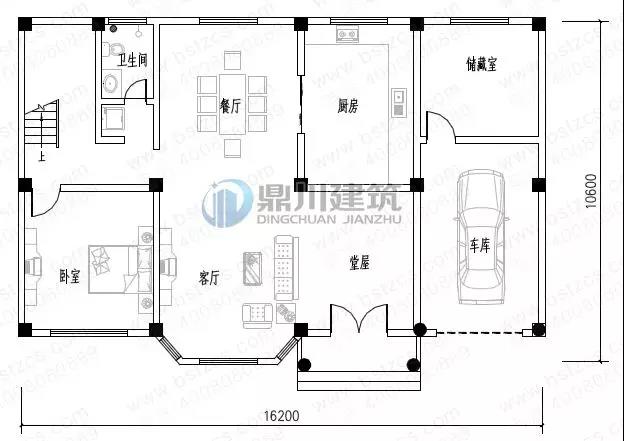 一 層: 入口玄關、客廳、餐廳、廚房、客房、衛(wèi)生間、車庫