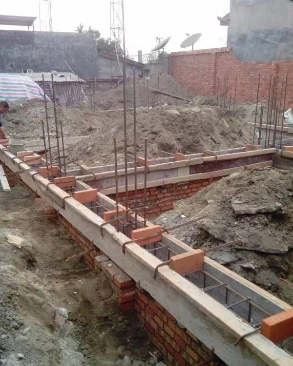 基礎(chǔ)之上砌筑紅磚基礎(chǔ)墻,基礎(chǔ)墻之上澆筑鋼筋混凝土地圈梁,這是正規(guī)的條形基礎(chǔ)做法,抬高了地坪高度也更利于防水防潮。