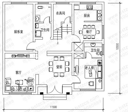 一 層: 堂屋、客廳、老人房(附衛(wèi)生間)、娛樂室、廚房、餐廳、農(nóng)具間、衛(wèi)生間
