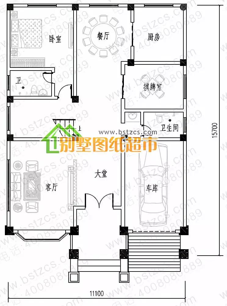 一 層:客廳(中空)、臥室(附衛(wèi)生間)、棋牌室、廚房、餐廳、衛(wèi)生間、車庫(kù)