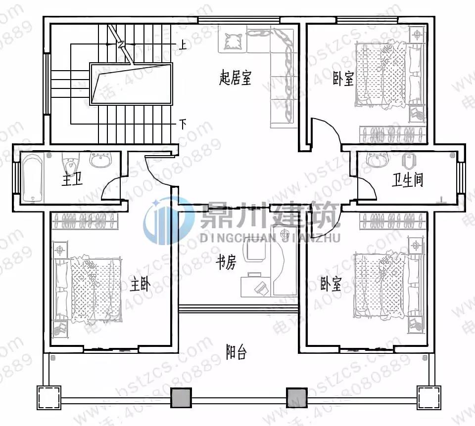 二 層:起居室、臥室(附衛(wèi)生間,陽(yáng)臺(tái))、臥室(附陽(yáng)臺(tái))、臥室、書(shū)房、衛(wèi)生間
