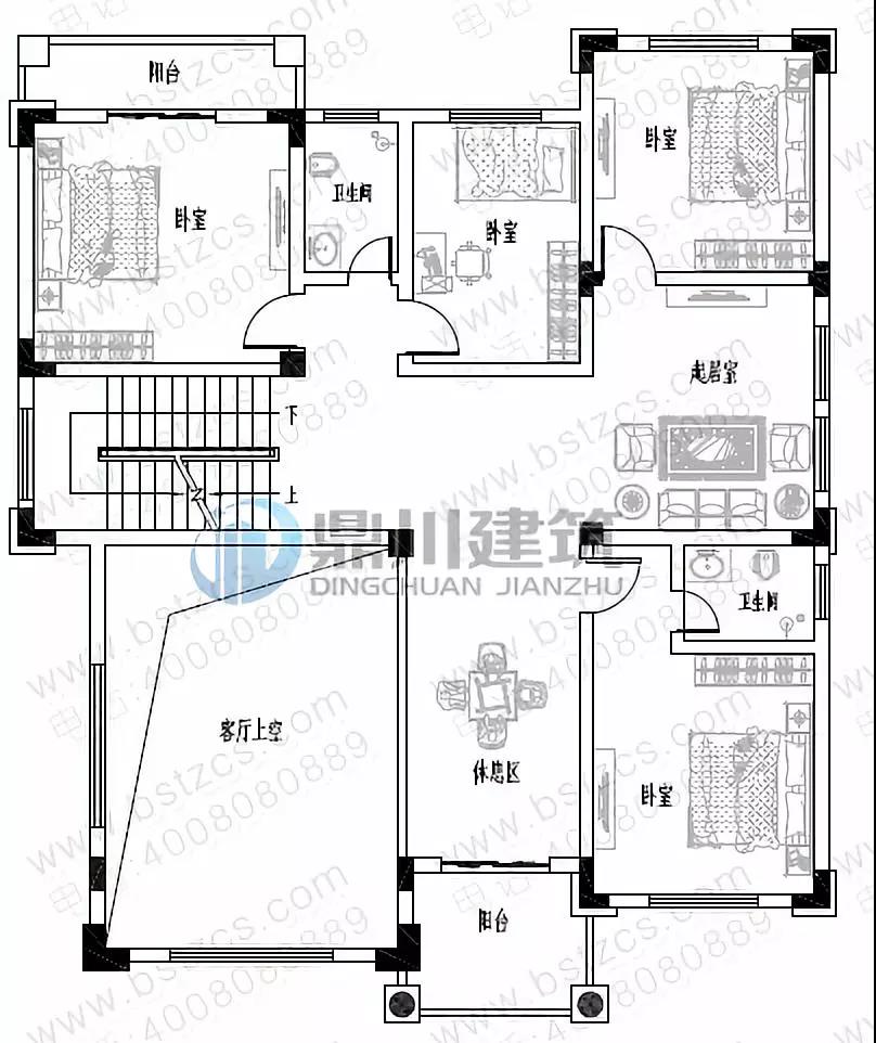 二 層:休息廳、臥室(附衛(wèi)生間,陽(yáng)臺(tái))、臥室(附陽(yáng)臺(tái))、臥室、衛(wèi)生間