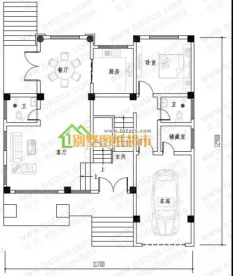 一 層:玄關(guān)、客廳、臥室、廚房、餐廳、2衛(wèi)生間、車庫(kù)(附儲(chǔ)藏間)