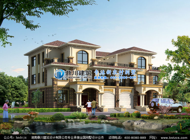 S049漂亮的三層帶車庫雙拼別墅外觀效果圖,鼎川建筑雙拼別墅設(shè)計圖