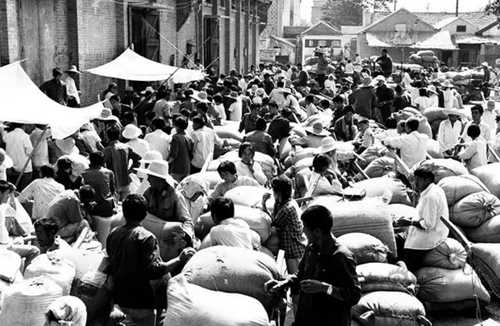 ▲1981年,安徽鳳陽縣農(nóng)民交公糧的情景。