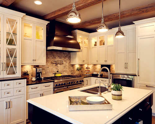 選擇使用多門組合方式,它可以非常人性化的為廚房進行海量收納。這個廚房多采用嵌入式設(shè)計的家具,一體式多門組合櫥柜和嵌入式的烤箱和洗碗機,加上合理的功能區(qū)域布置,使整個廚房井然有序,實用性強大。