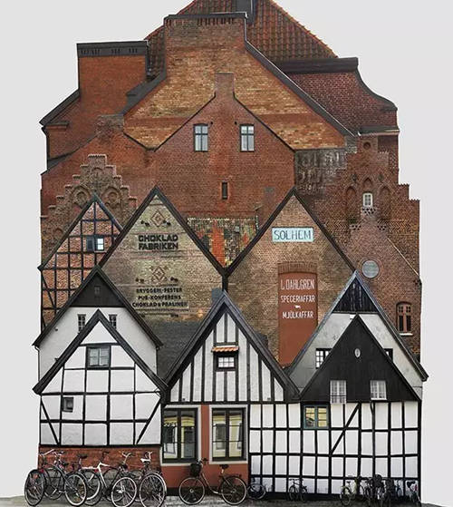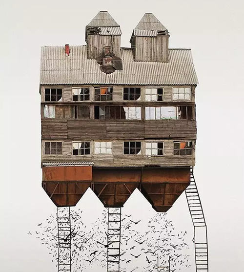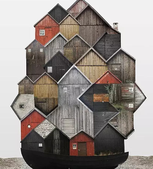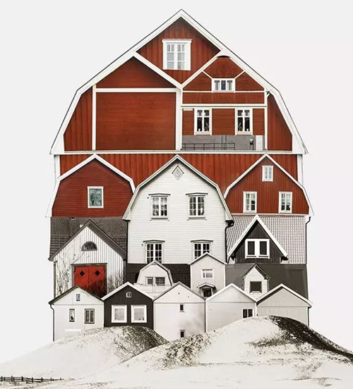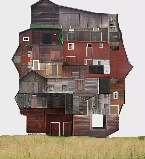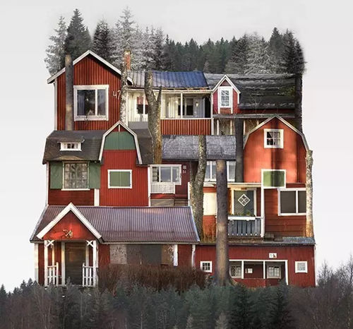 該系列拼接畫名為“genius loci(地方風(fēng)氣)”,描繪了由許多小房屋構(gòu)成的大房子,這些房屋都是某個(gè)地方或國(guó)家特有的風(fēng)格。它們連接著這些地方的土地,承載著這些地方的精神,不僅體現(xiàn)了虛擬的建筑現(xiàn)實(shí)(由各種門窗隨意、古怪地堆積在一起),而且體現(xiàn)了當(dāng)?shù)氐奈幕蜕罘绞健?/p>
