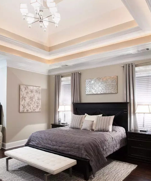 視覺特點:層數(shù)在2層以上的吊頂。適用房間:多用于裝有中央空調(diào)的戶型,因為中央空調(diào)厚度多在35厘米左右,迭級吊頂能夠增加層次感,對房高要求較高,一般要求要在2.7米以上。適合風(fēng)格:現(xiàn)代簡約。