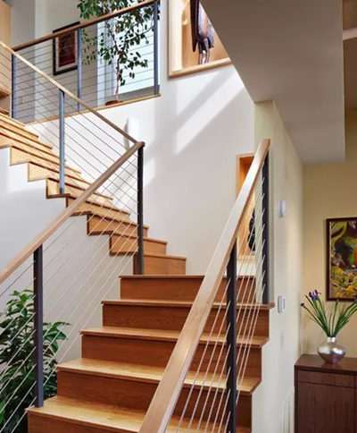 樓梯有很鮮明的指向性,面對(duì)樓梯,誰(shuí)都會(huì)不由自主地拾級(jí)而上。所以,切忌進(jìn)門處的樓梯直接指向通往臥室區(qū)的走廊,以將人們的目光引向私密空間。